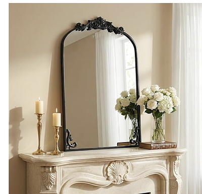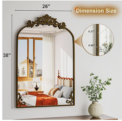 About this item Elegant Design: This arched wall mirror features a vintage-inspired design with intricate decorative details. You have the option to install the ornate Baroque embellishment at the top, allowing for ornament based on your style and preferences. This vintage mirror adds a touch of sophistication and elegance to your home decor, making it a stunning addition to bathrooms, bedrooms, or dressing areas. Perfect for those who appreciate classic charm and functionality Clear Reflection: Crafted from high-quality glass, this bathroom mirror ensures a sharp and distortion-free reflection, making it perfect for daily grooming, beauty routines, and outfit checks. Designed with a vintage touch, this decorative vanity mirror seamlessly combines functionality with elegance. It enhances any space with its sophisticated charm, helping you look and feel your best every day Durable Frame Mirror: This arched mirror features a sturdy and long-lasting frame designed to withstand the test of time. Its rust-resistant frame makes it perfect for humid environments like bathrooms, ensuring both beauty and functionality for years to come. As an elegant antique-style wall mirror, it serves as a stunning decorative addition to any home Wall Mirror: This lightweight hanging mirror comes with all the necessary mounting hardware for quick and hassle-free installation. Simply secure the included screws into your desired location to ensure the wall-mounted mirror stays firmly in place for long-term stability. The decorative top piece can be easily attached or removed, allowing you to customize the mirror's look to match your personal preference Easy Maintenance: This antique mirror features a waterproof and fog-resistant surface, making it effortless to clean and maintain. Simply wipe the vanity mirror with a damp cloth to keep it looking fresh and pristine. If you prefer not to drill into the wall, this versatile mirror can also be leaned against your console table, vanity table, or any desired surface for convenient use